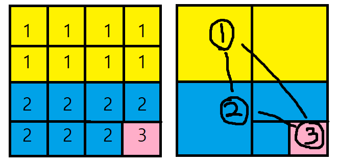 bfs를 통해 구역을 나누어 보면 다음 이미지와 같은 배열을 얻을 수 있습니다.