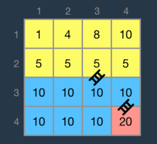 [[1, 4, 8, 10], [5, 5, 5, 5], [10, 10, 10, 10], [10, 10, 10, 20]] 3 15 [[10, 11, 10, 11], [2, 21, 20, 10], [1, 20, 21, 11], [2, 1, 2, 1]] 1 18