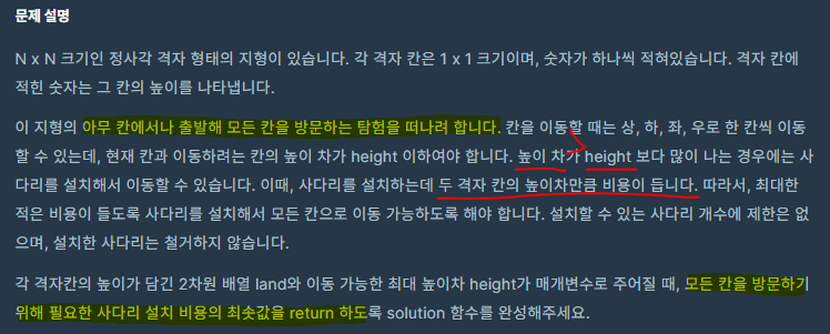 그래프 문제가 풀고싶던 와중에 문제 제목만 봐도 그래프 문제 느낌이 나서 오늘은 "지형 이동" 문제를 풀어 보겠습니다.