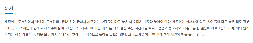 세준이는 도서관에서 일한다. 도서관의 개방시간이 끝나서 세준이는 사람들이 마구 놓은 책을 다시 가져다 놓아야 한다. 세준이는 현재 0에 있고, 사람들이 마구 놓은 책도 전부 0에 있다. 각 책