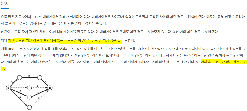 1. 구하고자 하는 "거의 최단 경로"란 최단 경로에 포함되지 않는 도로로만 이루어진 경로 중 짧은 것을 말합니다.